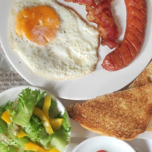 Thịt xông khói nướng giòn, trứng, cà chua nướng, sandwich nướng giòn