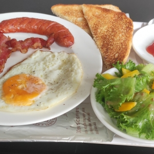Thịt xông khói giòn, trứng, cà chua bi, sandwich nướng giòn, xúc xích xông khói Đức